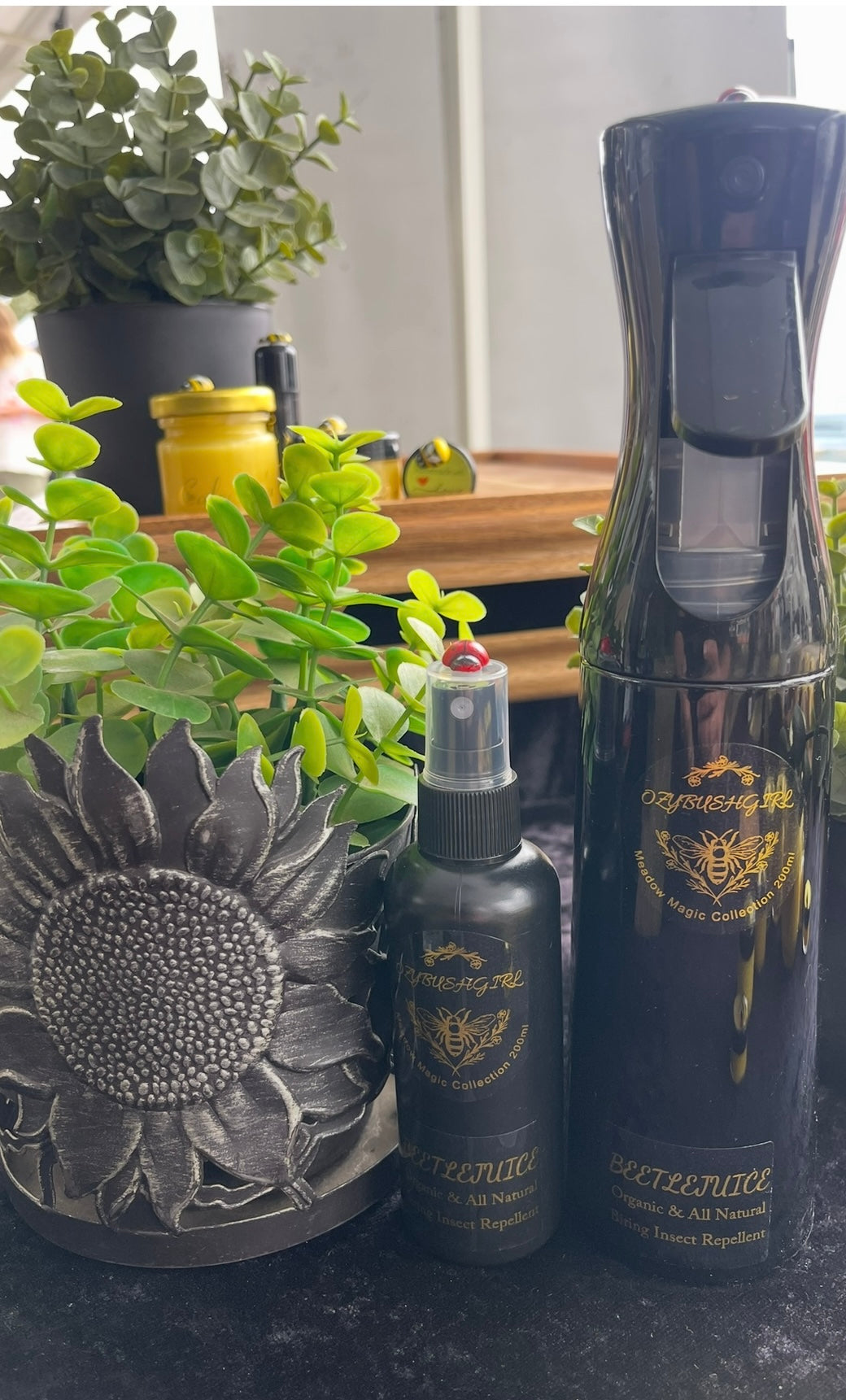 Beetlejuice Biting Insect repellent 100mls is a gentle blend of unique essential oils & aqua, this blend is amazing in repelling mozzies, ants, leeches, ticks etc ( larger bottles avail from sept 2026 until sold out )